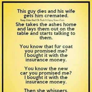 This guy passes away and his wife gets him cremated.She takes the ashes home and lays them out on the table and starts talking to them. You…