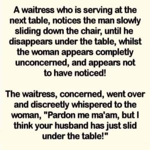 Their waitress, taking another order at a table a few paces away noticed that the man was slowly sliding down his chair and under the table, with…